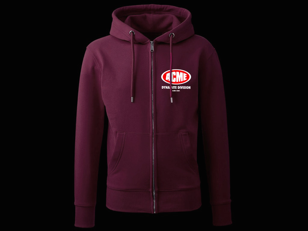 Inspired by the fictional corporation that features prominently in the Road Runner/Wile E. Coyote animated shorts as a running gag. Hand screen printed on a premium soft-style zip-up hooded top. Made from an organic cotton combined with an ethically sourced recycled polyester (80% organic cotton/20% recycled polyester). *WE RECOMMEND CHECKING YOUR SIZE BEFORE ORDERING*