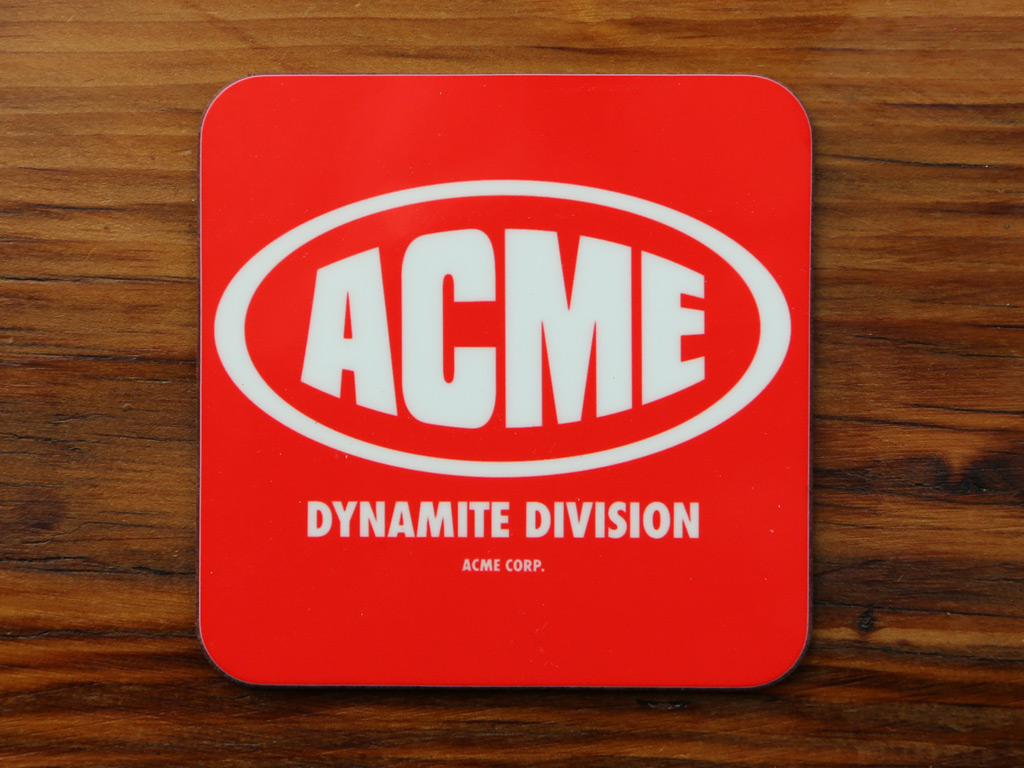 9cm square coaster. Made from 3mm thick hardboard with a single-sided full colour print. Graphic inspired by the fictional corporation that features prominently in the Road Runner/Wile E. Coyote animated shorts as a running gag.