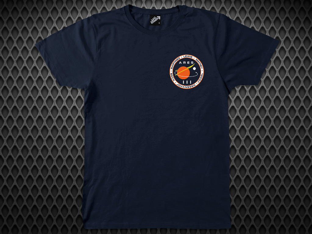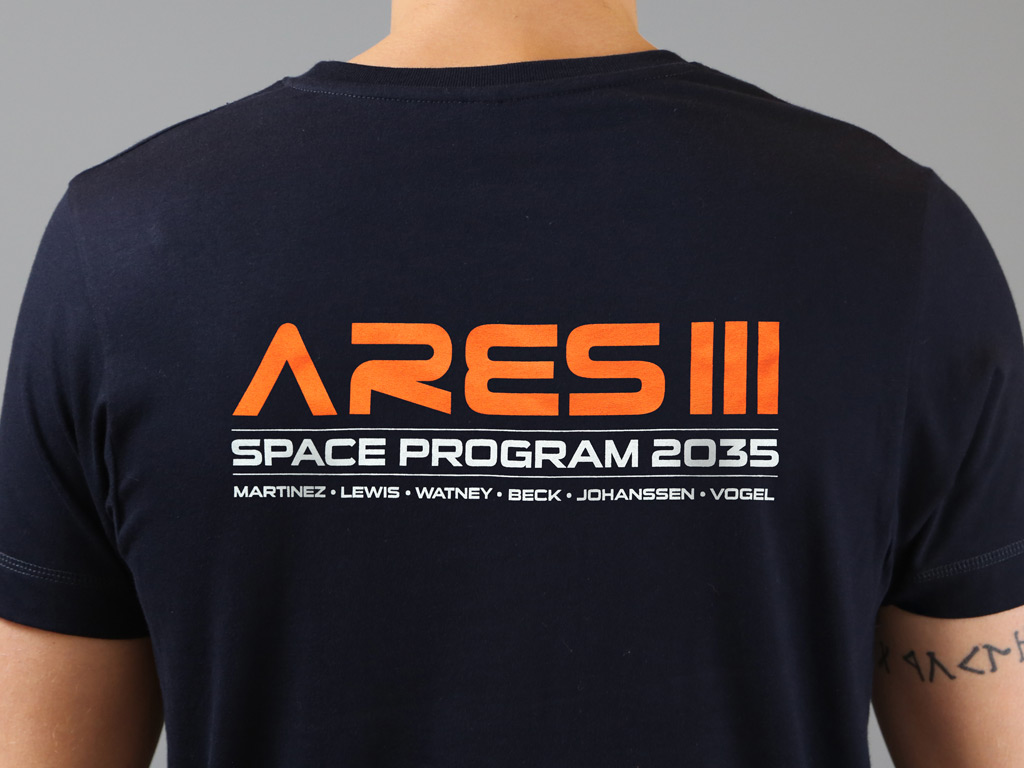 Hand screen printed on the breast and back of a navy soft jersey T-shirt inspired by the fictional Ares III mission to Mars featured in The Martian, the 2015 science fiction film directed by Ridley Scott and starring Matt Damon.
