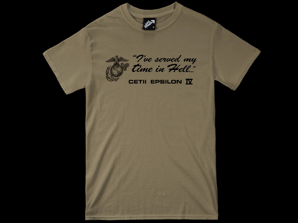 Based on the T-shirt worn by Drake (actor Mark Rolston) in the film Aliens. Hand screen printed on a regular fit tan coloured T-shirt.