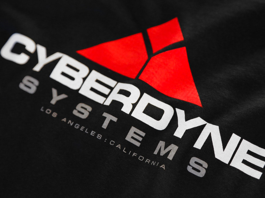 A hand screen printed black T-shirt inspired by the fictional manufacturing corporation which develops Skynet, the destructive artifical intelligence system featured in The Terminator, the 1984 science-fiction action film directed by James Cameron and starring Arnold Schwarzenegger, Linda Hamilton and Michael Biehn.