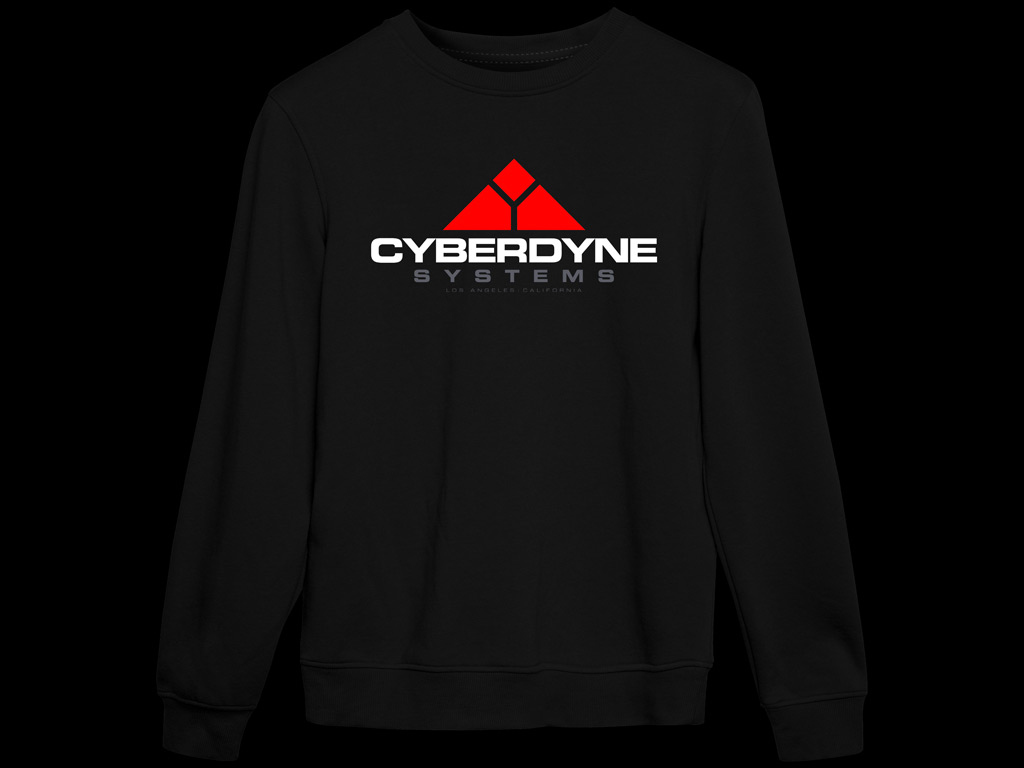 Hand screen printed on a black soft feel crew neck sweatshirt inspired by the fictional manufacturing corporation which develops Skynet, the destructive artifical intelligence system featured in The Terminator, the 1984 science-fiction action film directed by James Cameron and starring Arnold Schwarzenegger, Linda Hamilton and Michael Biehn.