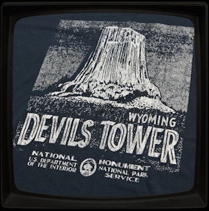Hand screen printed on a stone wash denim ladies fit T-shirt. Inspired by the location featured in the 1977 film, Close Encounters of the Third Kind. This American science fiction classic was written and directed by Steven Spielberg and stars Richard Dreyfuss.