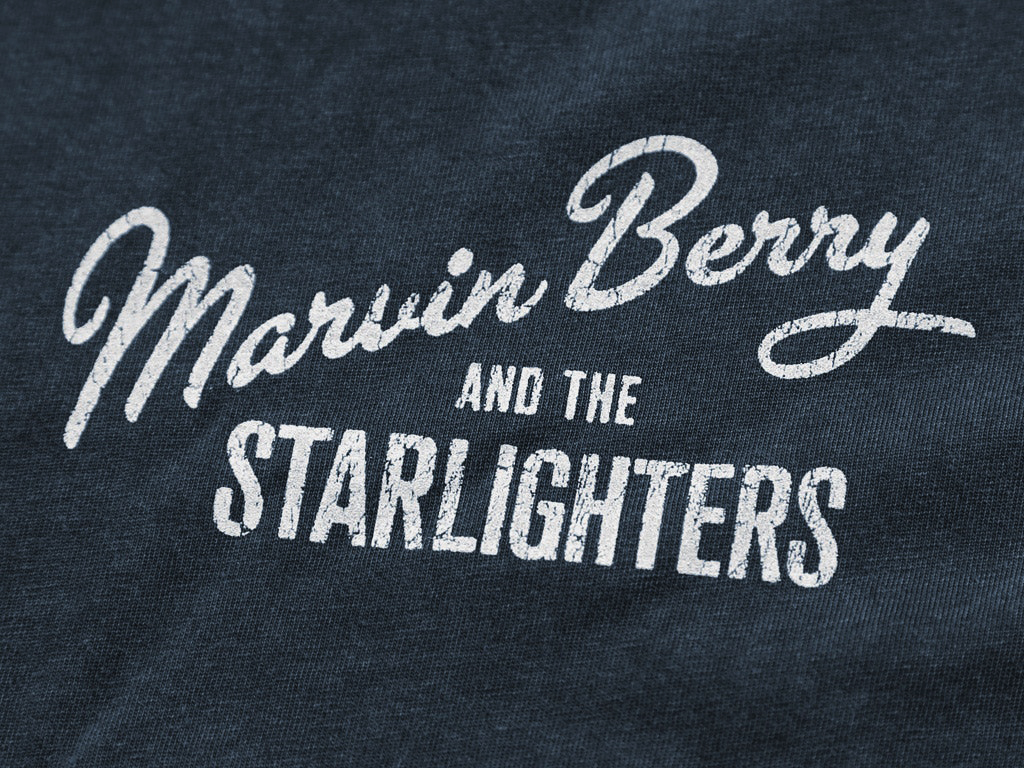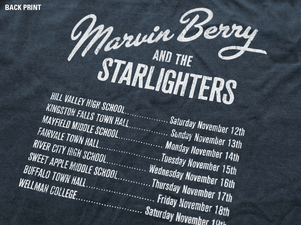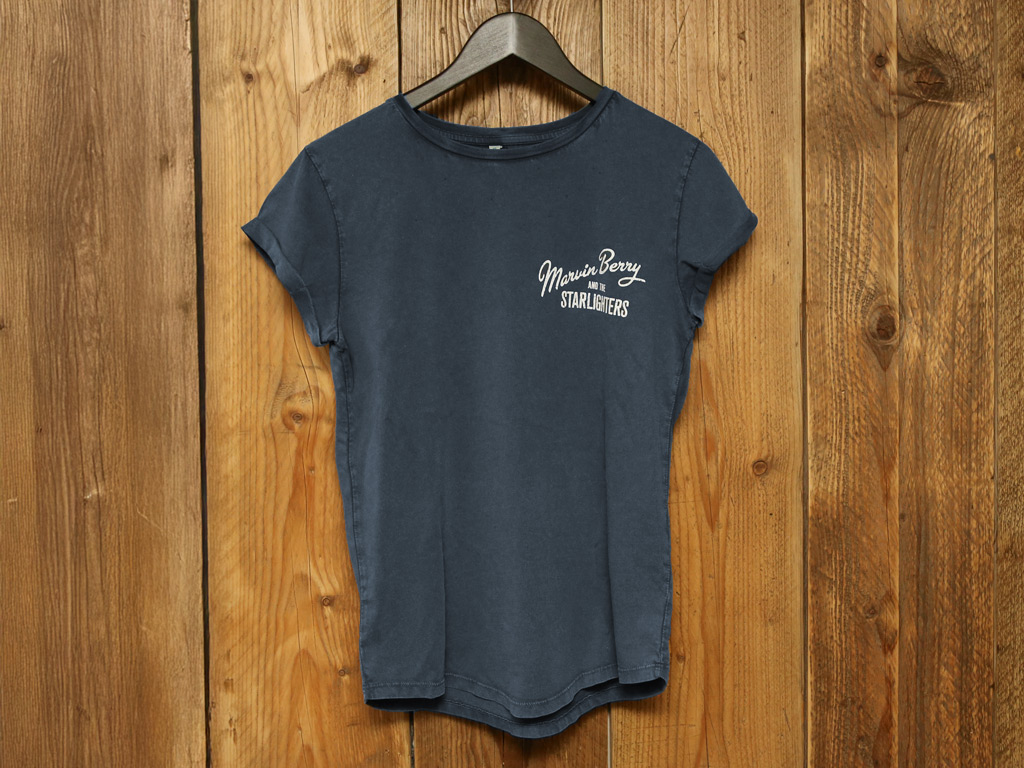 Marvin Berry and the Starlighters were a fictional 1950s band in Back to the Future, famous for performing at the Enchantment Under the Sea dance where Marty McFly played guitar. This design is hand screen printed on a stone wash denim ladies fit T-shirt made from an organic material with a soft worn feel.