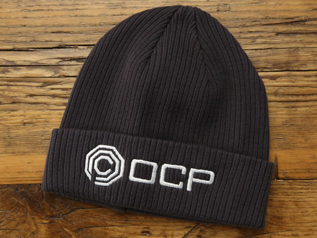 A ribbed single layer knitted folded Beanie with embroidered design and made from 100% organic cotton. One size fits all. Inspired by the fictional megacorporation Omni Consumer Products featured in the film RoboCop. Please remove any tags carefully preferably with scissors.