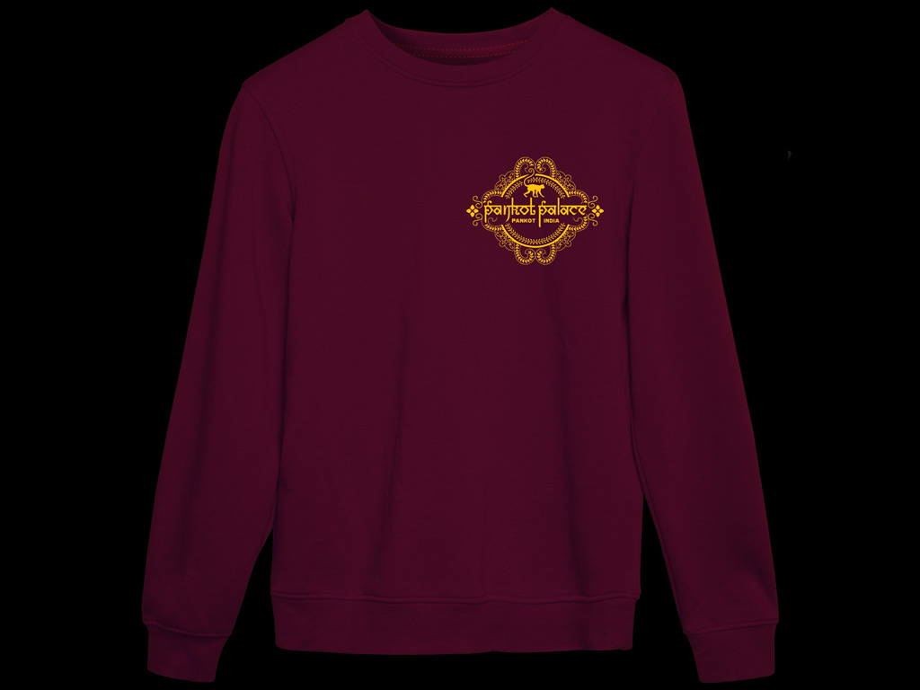 A hand screen printed burgundy soft feel crew neck sweatshirt inspired by the fictional location featured in the 1984 film Indiana Jones and the Temple of Doom. The action-adventure film was directed by Steven Spielberg and stars Harrison Ford, Kate Capshaw, Amrish Puri and Jonathan Ke Quan.