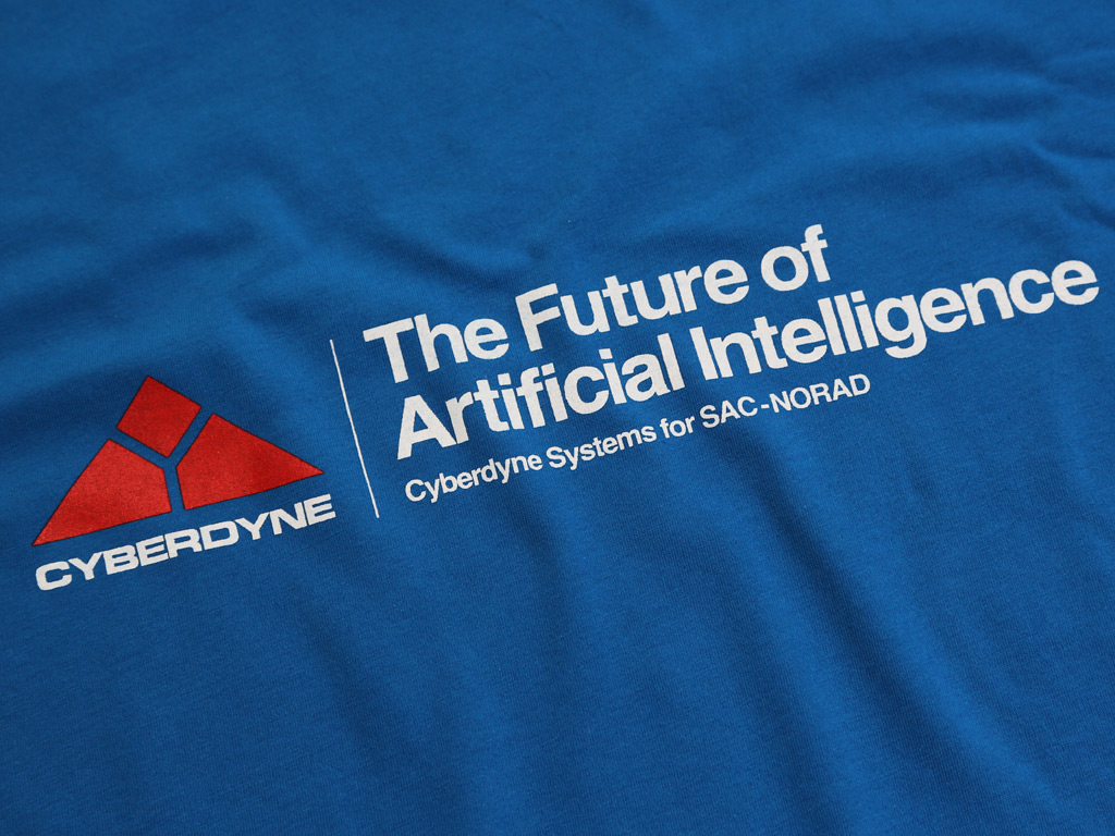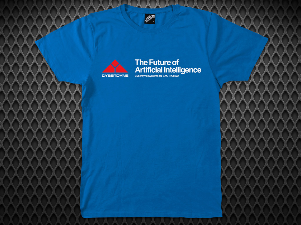 A hand screen printed bright blue soft jersey T-shirt - inspired by the 1984 American science-fiction action film directed by James Cameron, starring Arnold Schwarzenegger as the Terminator, a cyborg assassin sent back in time from 2029 to 1984.