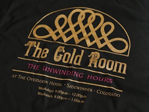 A hand screen printed black T-shirt inspired by The Shining, a 1980 horror film directed by Stanley Kubrick and starring Jack Nicholson.