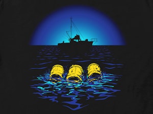 A hand screen printed black T-shirt inspired by the 1975 film Jaws, the American thriller directed by Steven Spielberg starring Roy Scheider, Robert Shaw and Richard Dreyfuss.