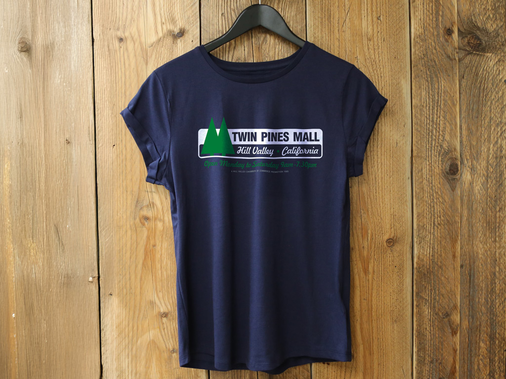Inspired by the fictional location featured in the film, Back to the Future, a 1985 American science fiction film directed by Robert Zemeckis and starring Michael J. Fox, Christopher Lloyd, Lea Thompson, Crispin Glover and Thomas F. Wilson. This design is hand screen printed on a navy ladies fit T-shirt made from an organic material with a soft worn feel.