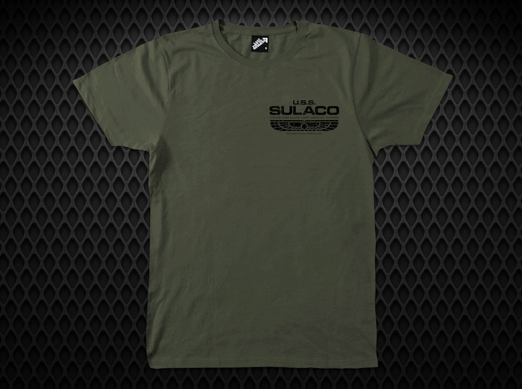 A single colour breast print design, hand screen printed on a regular fit 100% cotton olive T-shirt. Inspired by the fictional space craft featured in the 1986 film, Aliens, written and directed by James Cameron and starring Sigourney Weaver, Carrie Henn, Michael Biehn, Paul Reiser, and Lance Henriksen.