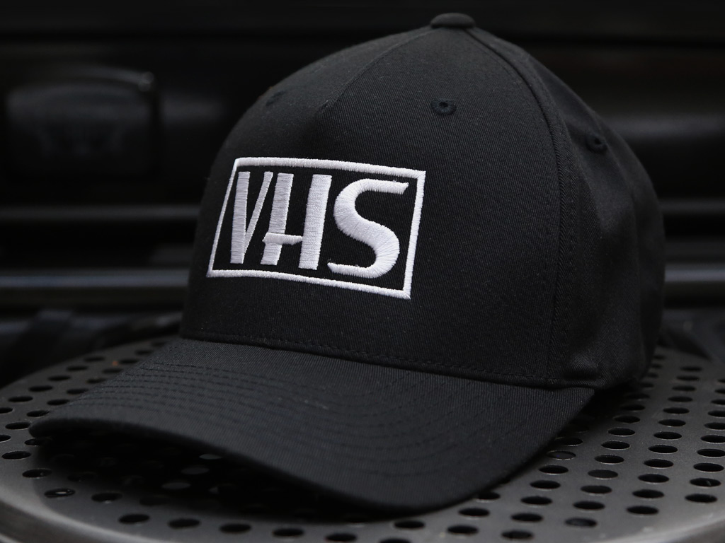 Spandex has been woven into the brushed cotton twill cap to allow for maximum stretch and comfort. Three sizes to choose from: Small: 54cm to 56cm, Large: 57cm to 60cm or XXL: 62cm to 65cm. Based on the VHS logo originally designed by Leo Weisz.