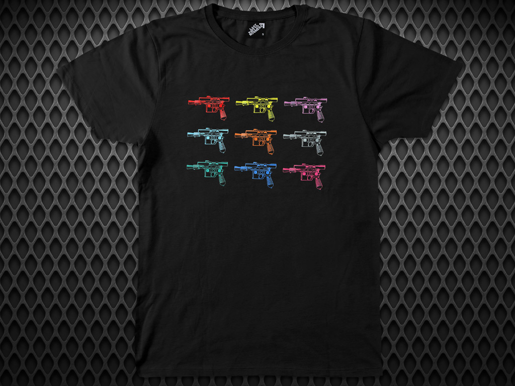 Pop art meets sci-fi: a T-shirt that reimagines Warhol’s “Gun, C.1982” fused with Han Solo’s iconic blaster. Bold lines, stark contrast, and just enough rebellion to feel dangerous. A mulitcoloured DTF print on a soft jersey T-shirt.