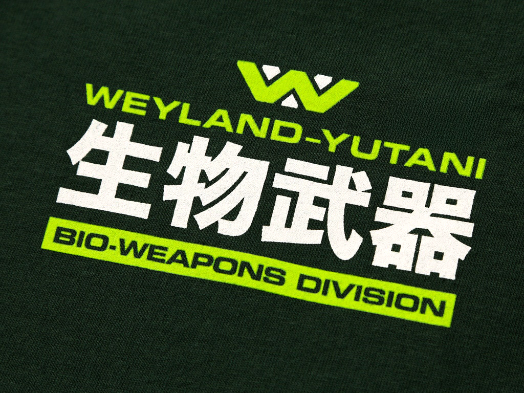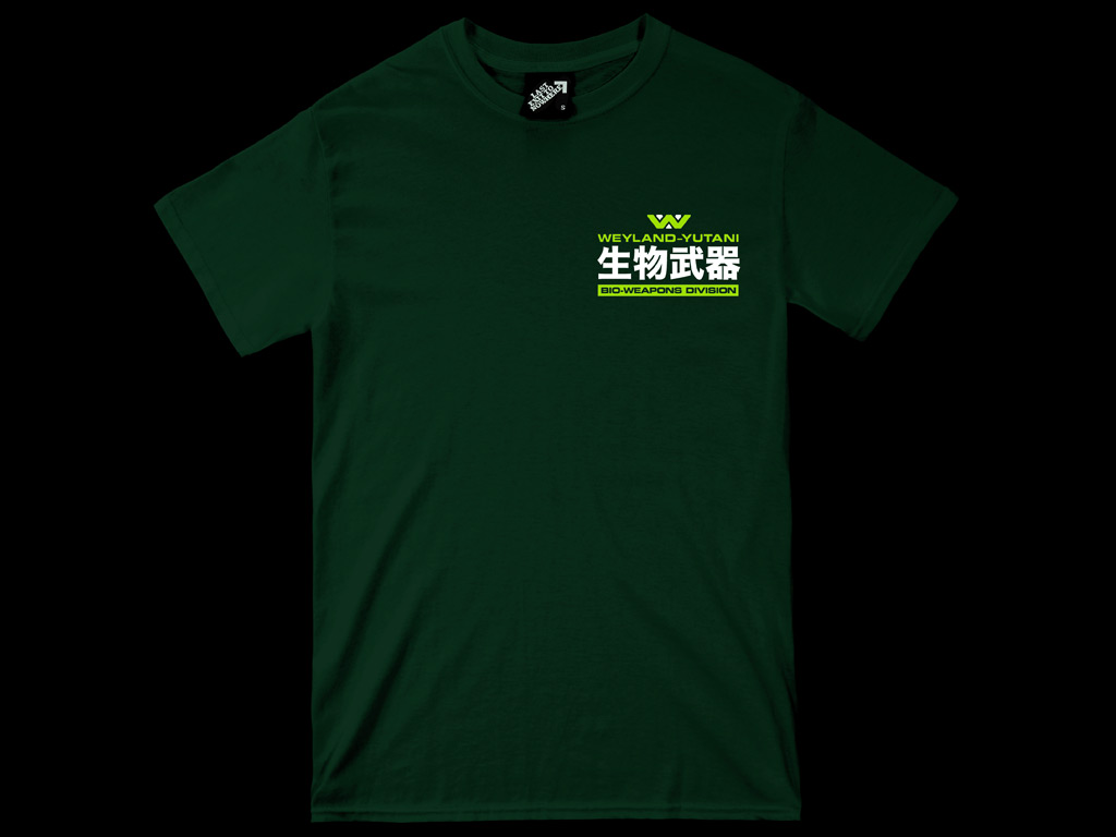 Hand screen printed on the breast of a bottle green regular fit t-shirt. Weyland-Yutani Bioweapons Division is responsible for researching and weaponising extraterrestrial lifeforms – specifically, the Xenomorphs, the lethal alien species first seen in Alien (1979).